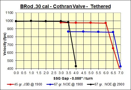The top one is a .357 cal, the middle one a .30 cal, and the bottom one a .25 cal, all running TJ's barrels.... They use regulated 500 cc, 3000 psi bottles, set to different pressures depending on calibre.... They all run balanced valves of some kind, a Cothran Powerhouse, an ART/SS, and my own design.... and they all run SSG's on the hammers (Stopping Spring Guides) to eliminate hammer bounce.... Here are the performance curves for the three different calibres....